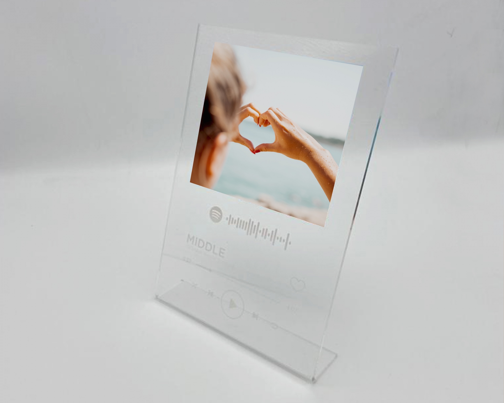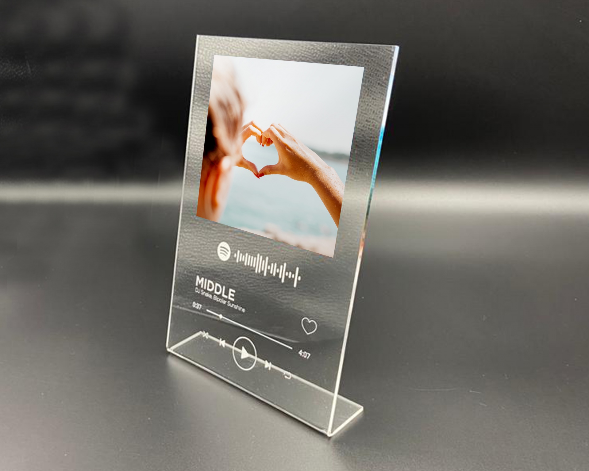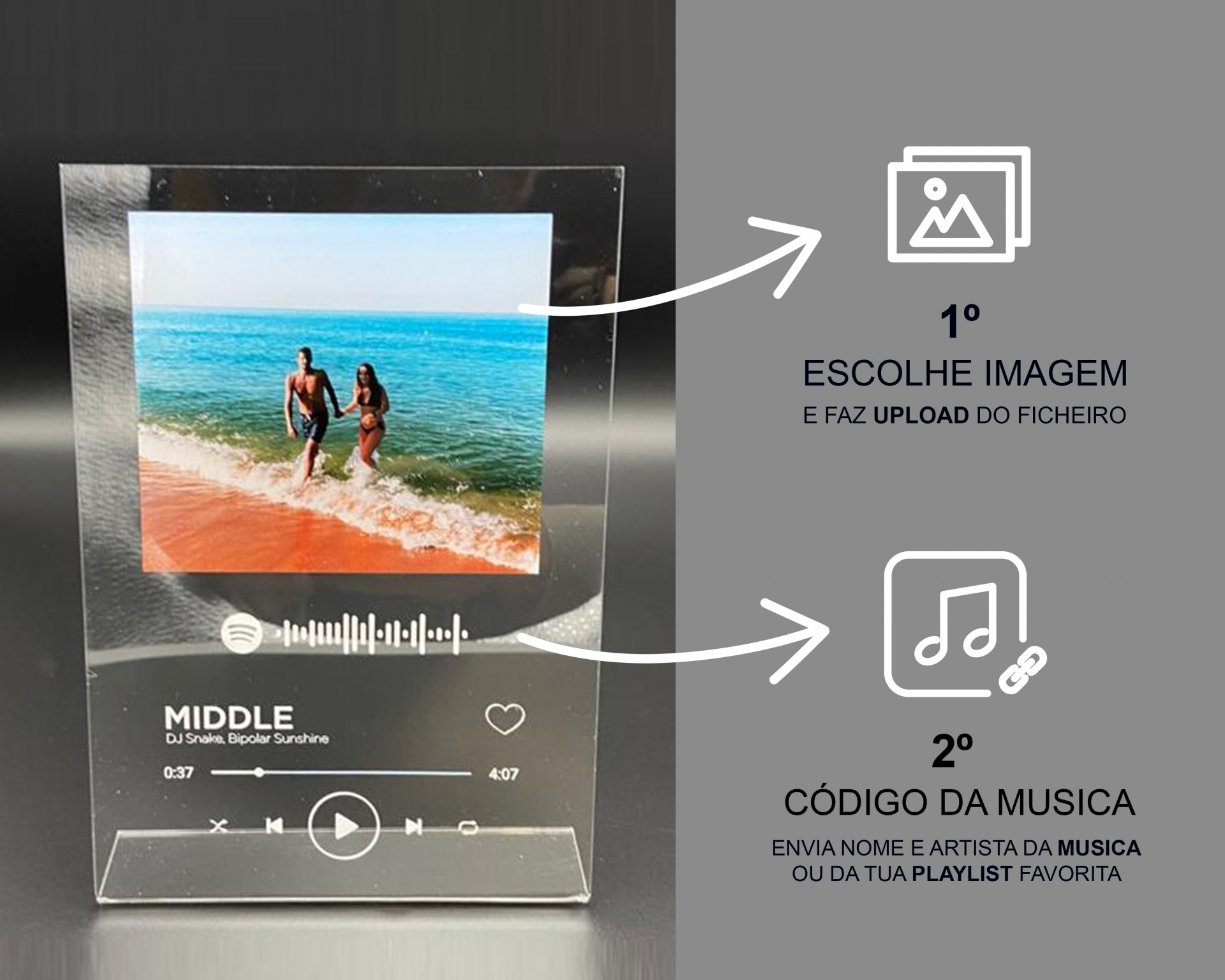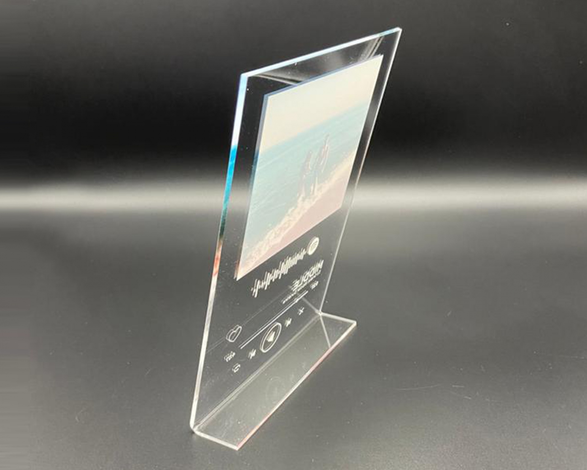 Placa de acrílico transparente com suporte e impressão a cores da fotografia, texto e código da sua música preferida impressos a branco.